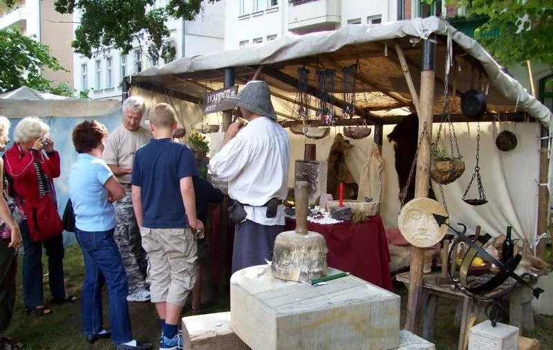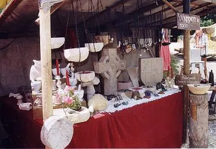 Eine treffliche Auswahl selbst gefertigter Werke sowie Natursteine aus aller Welt, zum Geschenke oder für den täglichen Gebrauch, werden feilgeboten. Um auch in den Abendstunden an dem Steinmetzstande zu frönen, wird dieser durch natürliche Fackelsteine und Kerzen ausgeleuchtet und erfährt dadurch ein ganz besonderes mittelalterliches Ambiente.
