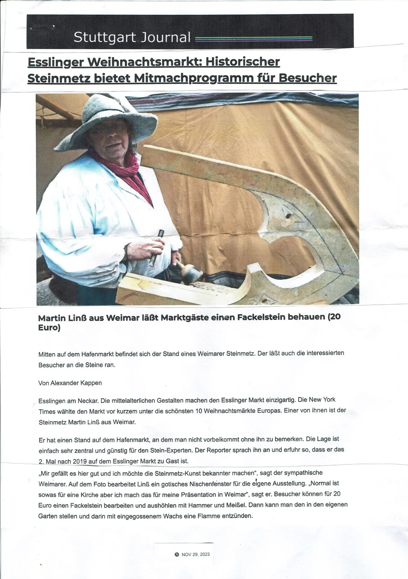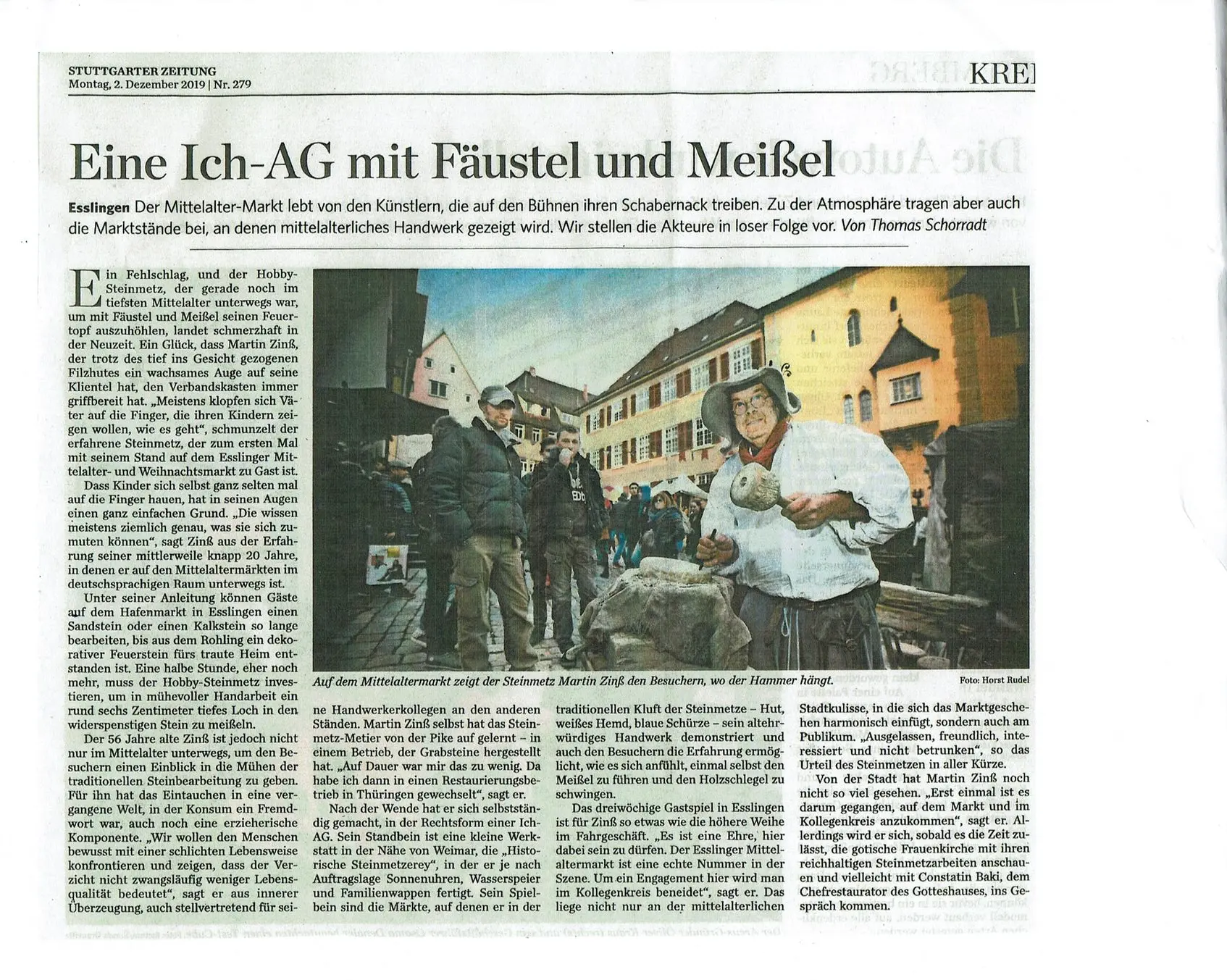 Meine Wanderschaft führt mich an zaubersvne Orte, an denen ich mein zünftiges Handwerk darbieten darf. So bin ich auf gar trefflichen Mittelaltermärkten, Festen, Events und Fachmessen anzutreffen. Als wahrlich berufener Steinmetz dünkt es mich, tatsächliche Auftragsarbeiten während des Getümmels zu vollenden.