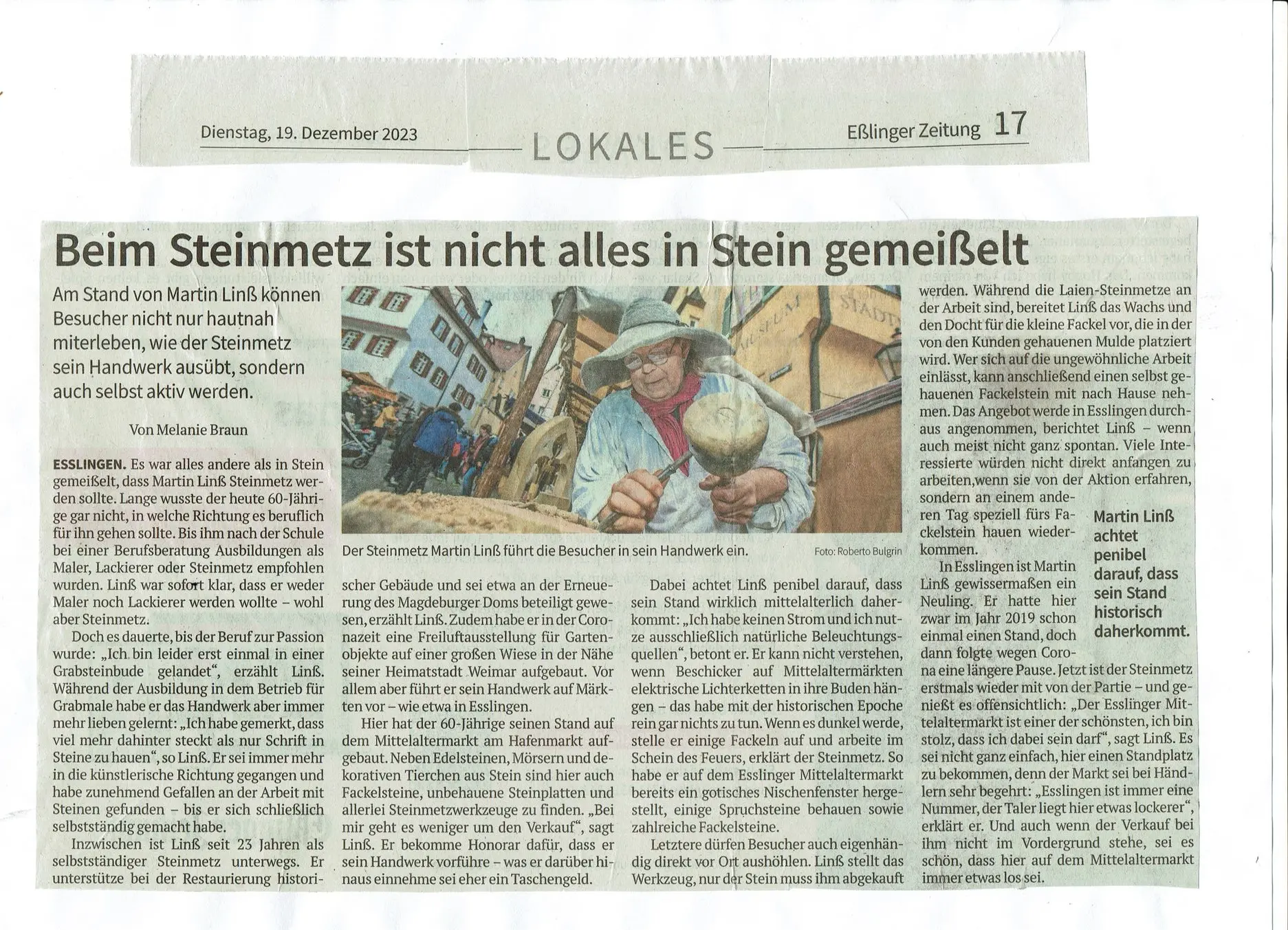 Der Steinmetzstand ist mit Liebe zum Detail historisch gestaltet und wird ausschließlich mit natürlichem Licht beleuchtet. Er fügt sich harmonisch in das Ambiente der Veranstaltung ein und macht Geschichte greifbar.
