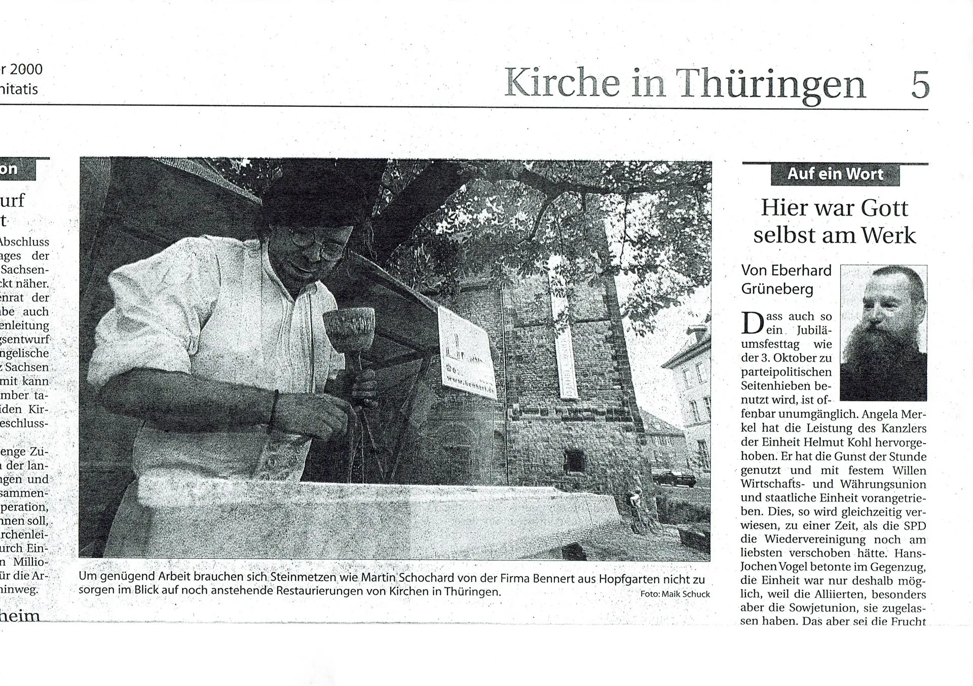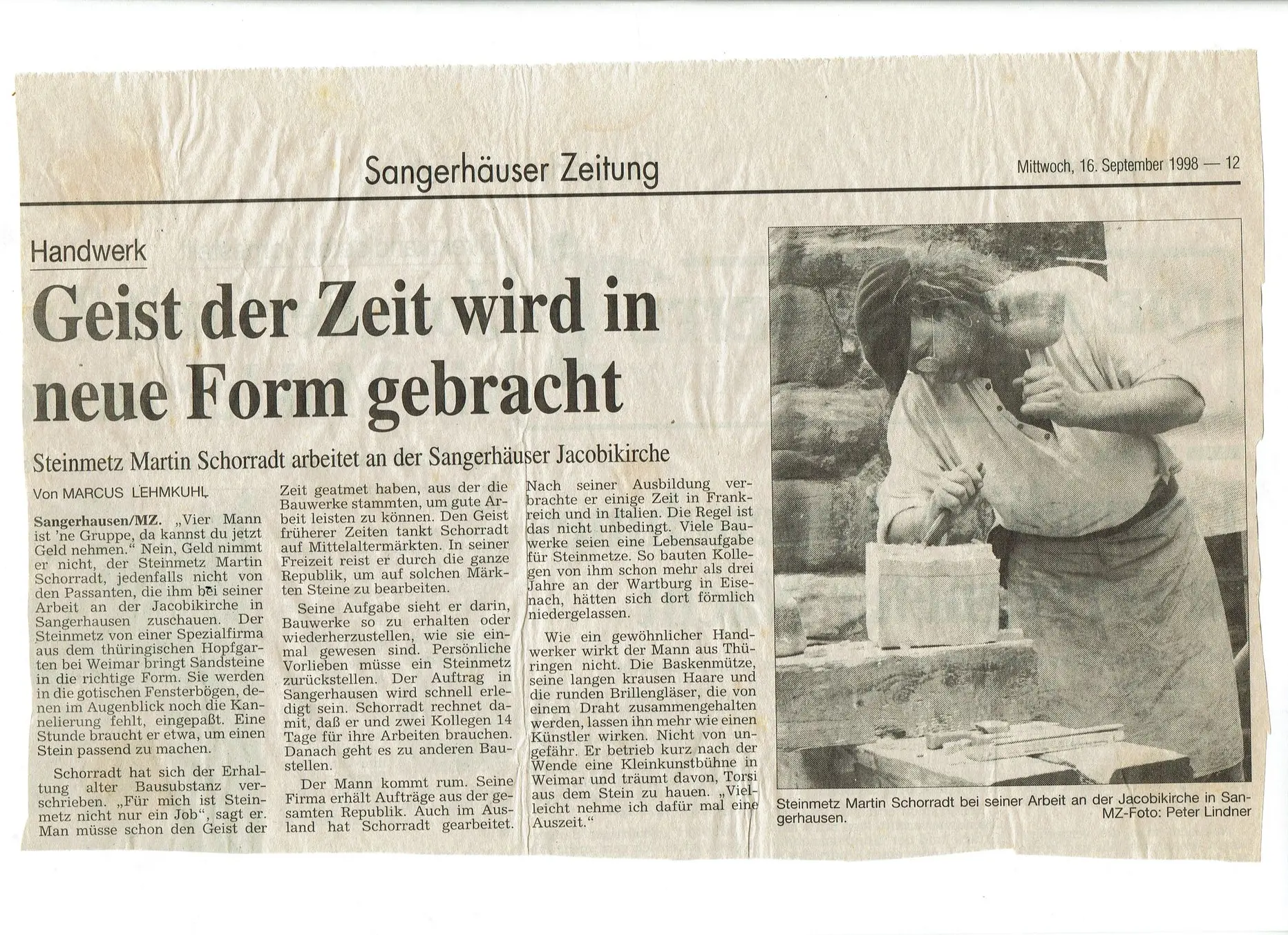 Nach der Ausbildung zum Steinmetz verbrachte Martin Linßi einige Zeit in Frankreich und Italien. Er arbeitete als Geselle in verschiedenen Spezialbetrieben für Steinrestaurierung und Denkmalpflege. Linß machte sich im Jahre 2000 selbstständig.. In meinem Atelier nahe Weimar arbeitet er an Passstücken, Profilläufe und Maßwerke für denkmal geschützte Bauwerke. Er ersetzt Kleinteile von alten Steinfiguren oder erschafft Steinbrunnen. Auftragsarbeiten führte er in Österreich und für Irland aus. Er sucht im Bereich der Dekmalpflege stets eine enge Zusammenarbeit mit dem Bauherren, Fachbetrieben, Steinrestauratoren, Architekten und der zu ständigen Denkmalpflegebehörde, um für die Projekte und Bauvorhaben die günstigsten Lösungen zu erarbeiten.. Priorität hat in der Regel die Bewahrung der historisch wertvollen Substanz.